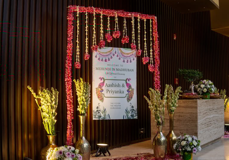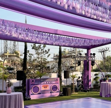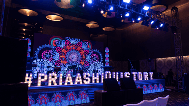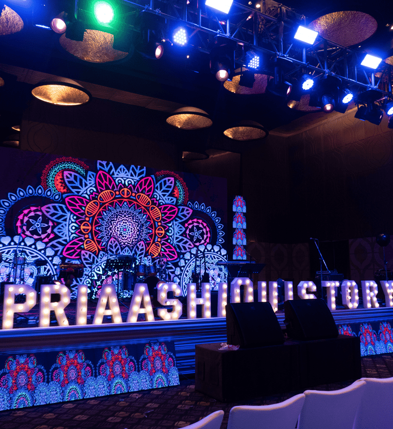 Sangeet Ceremony lit with vibrant lights, featuring a wonderful backdrop and signage.